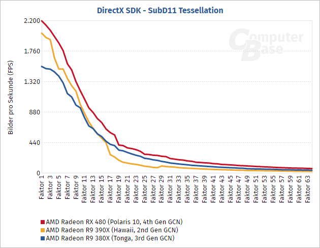 TessMark ukazuje, že čím vyšší úroveň teselace je použita, tím méně Radeon RX 480 ztrácí. Při úrovni ×64, kdy se Radeon R9 390X propadá na 19 % výkonu bez teselace, se dostává ke slovu technologie Primitive Discard Accelerator, díky níž se Radeon RX 480 drží na 28 % výkonu bez teselace (GeForce GTX 980 na 23 % výkonu bez teselace).