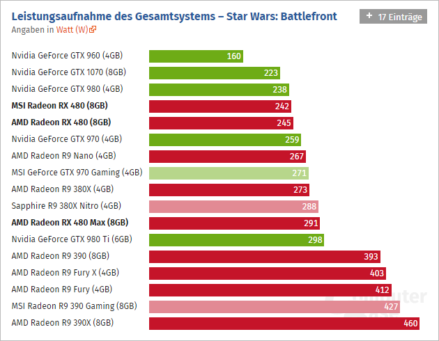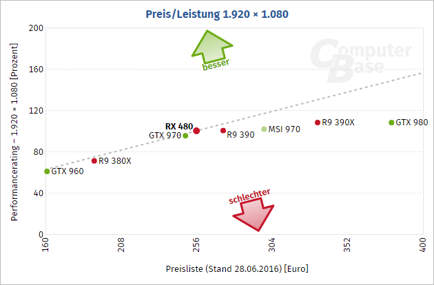 Pokud jde o výkon, nahrazuje Radeon RX 480 podle očekávání grafické karty s jádry Hawaii / Grenada, tedy Radeon R9 290, R9 290X, R9 390 a R9 390X. Pokud bychom posuzovali podle souhrnných výsledů redakce ComputerBase, které zakládají na setu 16 her (což je asi nejkomplexnější herní měření, které je v tuto chvíli k dispozici), je výkon Radeonu RX 480 nejblíže Radeonu R9 390:
