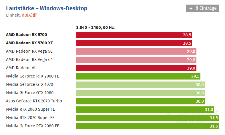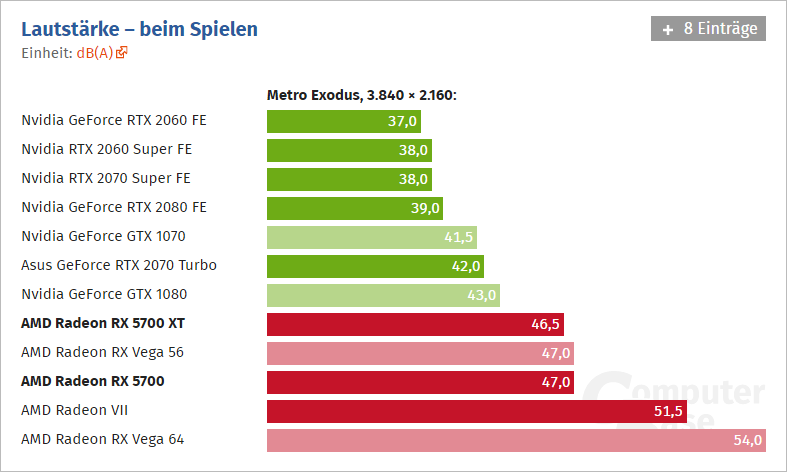 Pokud jde o hlučnost, můžeme zatím soudit pouze referenční provedení. Karty s alternativními chladiči by se měly do prodeje dostat v průběhu srpna. Ve 2D jsou výsledky bezkonkurenční. Ve 3D se hlučnost referenčních chladičů se výrazně snížila oproti tomu, co předváděl Radeon RX Vega 64 nebo Radeon VII. Je to dáno kombinací vylepšení chladiče a nižší spotřeby, díky čemuž oběma modelům stačí otáčky kolem 2100 RPM a nevyžadují ~2750 RPM jako Radeon RX Vega 64 nebo ~2900 RPM jako Radeon VII. Ve srovnání s GeForce je však hlučnost stále o 4-10 decibelů vyšší, podle toho, jaké modely srovnáváme.