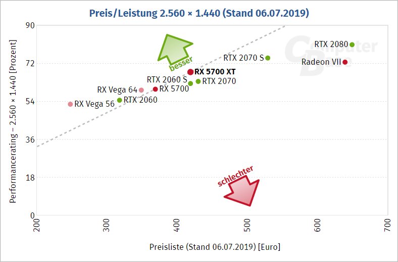 Poměrem cena / výkon jsou Radeony RX 5700 a RX 5700 XT výhodnější než GeForce RTX z řady Super. Lepší poměr cena / výkon má z řady Turing pouze výše zmíněná GeForce RTX 2060 (bez Super), ovšem na úkor menší paměti.