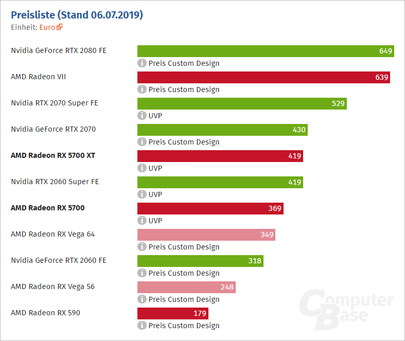 Jak již bylo řečeno, ceny Radeonů RX 5700 (XT) jsou příznivější, než bylo původně avizováno. Graf níže zachycuje srovnání cen v Německu. Je například patrné, že původní GeForce RTX 2060 bez Super se posunula na příznivější cenu odrážející deficit v podobě menší (6GB) paměti.
