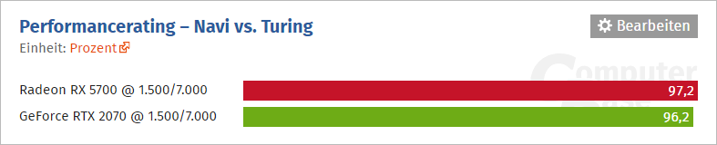 Redakce ComputerBase přistoupila k zajímavému experimentu. Na GeForce z generace Turing a Radeonu z generace Navi nastavila aktivních 2304 stream-procesorů, 64 ROP, 14 GHz GDDR6 a totožné takty jádra. Obě karty prohnala obvyklými herními testy a zjistila, že Navi architektonickou efektivitou nijak nezaostává za Turingem.