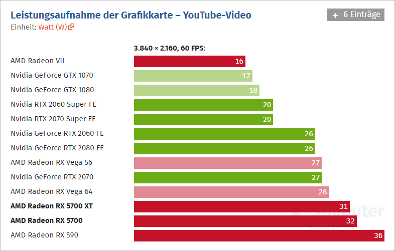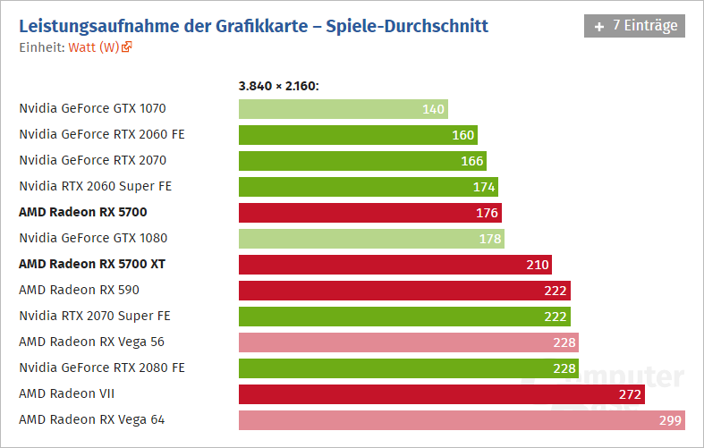 Ve hrách lze na situaci nahlížet dvěma způsoby: Při srovnání s dosavadními produkty AMD je situace výborná. Radeon RX 5700 XT je úspornější než Radeon RX 590, což při výkonu o 71 % vyšším stojí za zdůraznění. Ve srovnání s konkurencí již AMD nijak citelně nezaostává, ale ani nijak neexceluje. Není co vytknout ani za co chválit (pokud by předmětem chvály nebylo samotné mezigenerační zlepšení pozice): Radeon RX 5700 má spotřebu jako výkonnostně blízká GeForce RTX 2060 Super, Radeon RX 5700 XT má spotřebu mezi GeForce GTX 1080 a GeForce RTX 2070 Super, v jejichž rozpětí se nachází i výkonnostně.