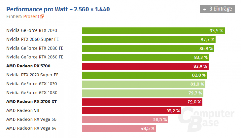 Od Radeonů RX 5000 se původně očekávalo, že přinesou výkon Radeonu RX Vega 56 v provedení, které bude pro výrobce karet nákladově levnější (GDDR6 místo HBM2 zaplacených v rámci ceny GPU). Výsledek je nakonec mnohem výš, i nižší Radeon RX 5700 je rychlejší než Vega 56 a FPS drží výše i tehdy, pokud Vega běží v 1920×1080 a RX 5700 v 2560×1440. Výkon je tedy příjemný, poměr cena / výkon rovněž. Energetickou efektivitou se nabídka AMD velmi těsně přiblížila nabídce Nvidie, architektonickou efektivitou ji těsně překonala.