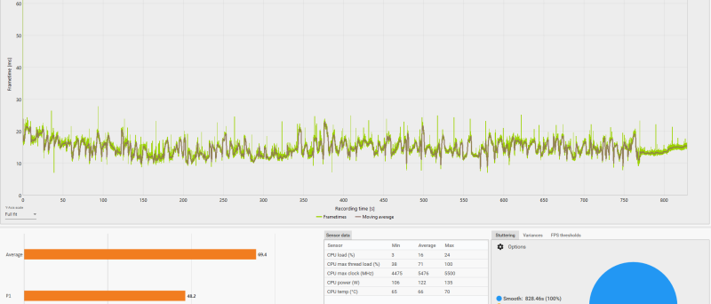 Test měřím za pomoci CapFrameX a na screenshotech můžete vidět velmi důležité údaje, jakými jsou frame times, v grafech pak můžete vidět průměrné FPS, 1% minima a 0,1% minima.