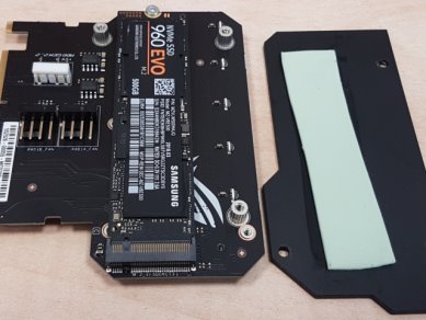 Také zde najdeme chladiče ve formě plechů, které kartu kryjí a odvádí teplo od obou disků, já jsem pro test osadil Samsung 970 EVO 500GB a také starší a teplejší Samsung 960 EVO 500GB. I přes horší průtok vzduchu v testovací NZXT H500i skříni(oproti jiným modelům) se disky nepřehřívají ani v zátěži, což je pozitivní. Na desce bohužel žádné další M.2 sloty nejsou, což je možná trochu škoda, díky mini-DTX formátu by mohlo být zajímavé někam vměstnat ještě třetí slot, jelikož dva M.2 disky umí i menší mini-ITX desky.