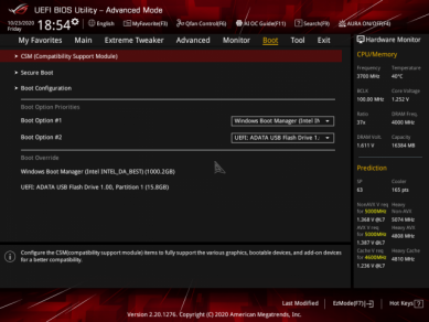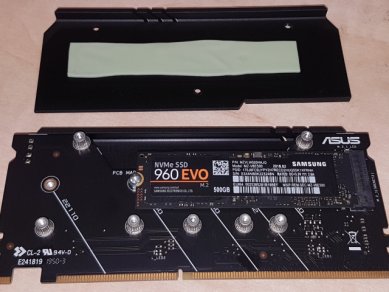 U DIMM M.2 se na chvíli zastavím, jedná se o poměrně zajímavé řešení, jak připojit M.2 disky do desky a zároveň jim zajistit rozumné chlazení. ASUS tuto kartu používá již několik generací u mnohých dražších základních desek. Do DIMM M.2 modulu lze osadit dva PCIe NVMe disky, přičemž každé dostane k dispozici čtyři PCIe Gen3 linky. Oba dva disky jsou připojené do Intel Z490 chipsetu, který poskytuje celkem dvacet čtyři PCIe Gen 3 linek, komunikace s procesorem pak probíhá tradičně přes čtyři Gen3 linky. Do karty jsem osadil dva starší Samsungy 960 EVO 500GB a vyrobil jsem na nich RAID0, protože proč ne.