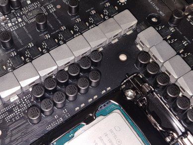Pořádná deska určená pro extrémní taktování potřebuje pořádnou napájecí kaskádu. ASUS se rozhodl nepodporovat integrovaná GPU a tím se tak uvolňuje prostor pro napájení procesoru, jelikož zde nejsou fáze pro iGPU, ale jen pro VCore a VCCSI. Chlazení napájecí kaskády je velmi robustní, součástí chladiče je i masivní kryt výstupů na desce. VRM pro jádro má celkem šestnáct fází složených z Infineon TDA21472 70A chytrých pwrstages. Nicméně PWM kontrolér ASP14051 neumí řídit šestnáct fází, proto ASUS použil paralelní zapojení a kontrolér tak vidí osm fází.