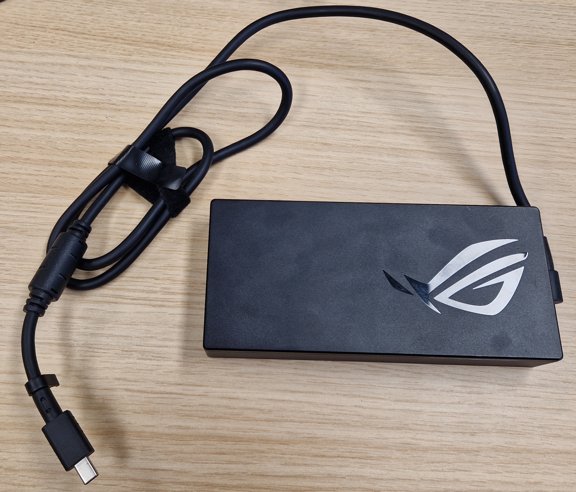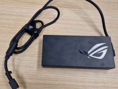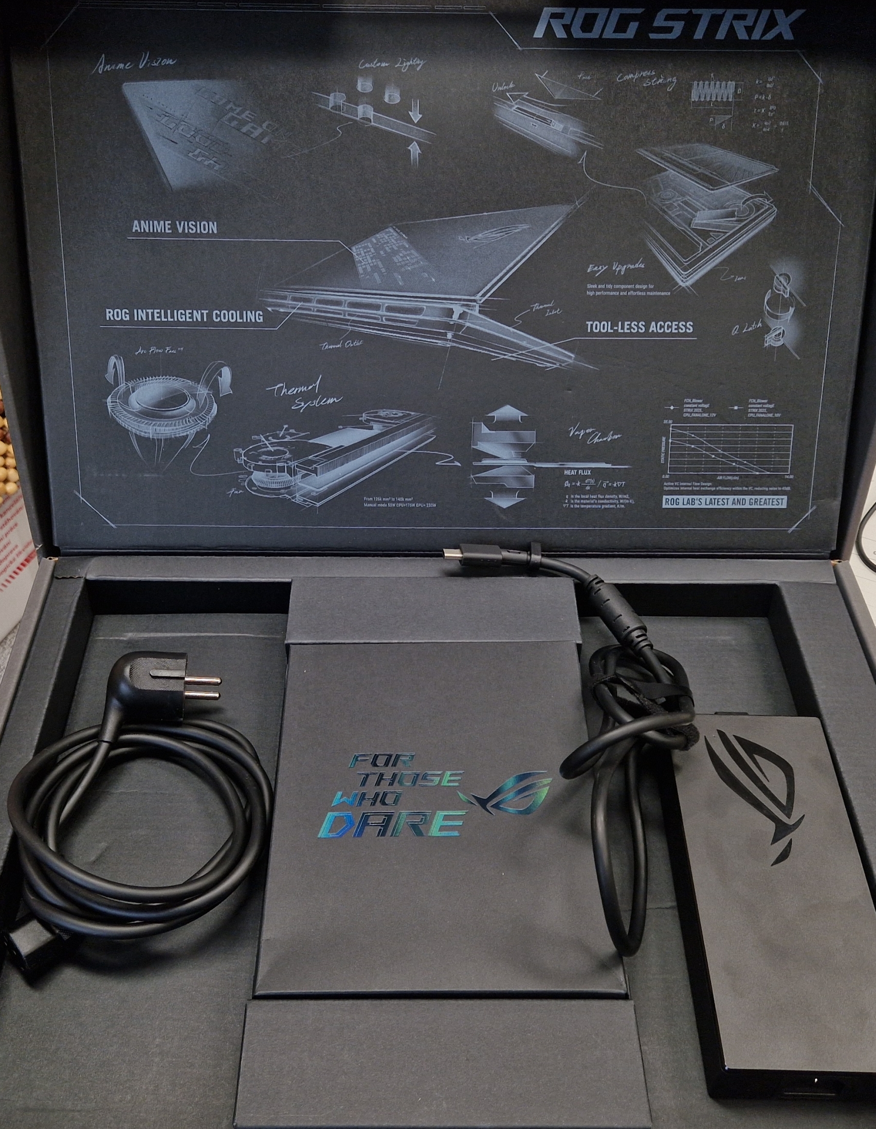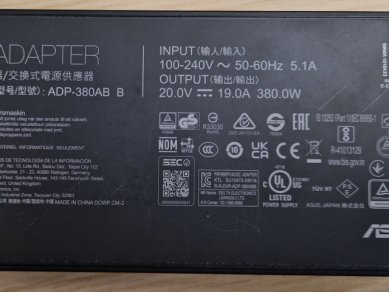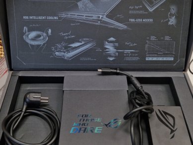 ASUS mi zaslal notebook ve svém standardním balení, uvnitř krabice nic moc speciálního nenajdeme, v podstatě jen samotný notebook a 380W napájecí adaptér, což je slušná cihlička.