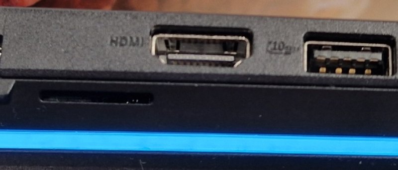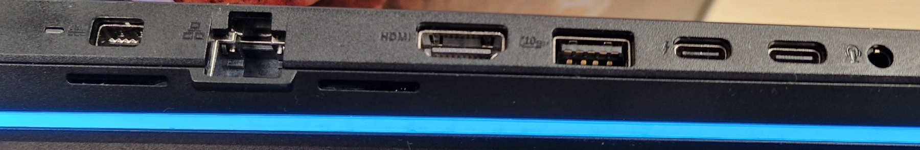Na levé straně najdeme hlavní část portů, napájecí konektor, RJ45 2,5GbE, HDMI 2.1 výstup, USB-A 10Gb/s a dva USB-C porty. Oba dva USB-C porty nabízí Thunderbolt 5 s DisplayPortem. Podporují také až 100W dobíjení notebooku. Výbavu zakončuje jeden 3,5mm audio combo jack.