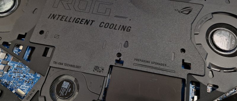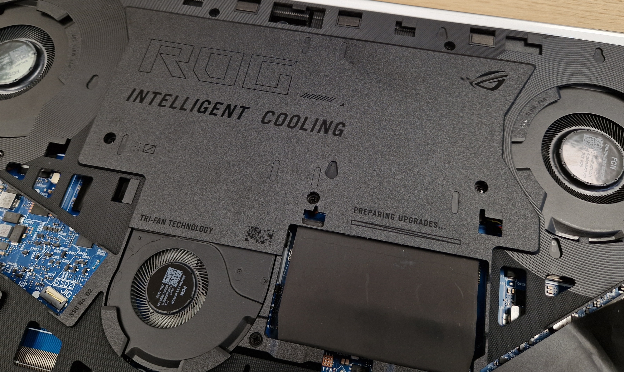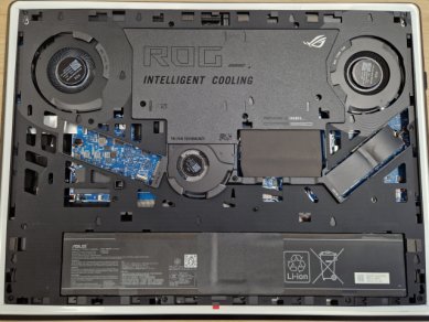 Uvnitř notebooku můžeme vidět jakýsi plastový skelet, který je možné více demontovat, pokud potřebujeme vyměnit základní desku nebo WiFi modul. SODIMM paměti jsou snadno přístupné, stejně tak oba dva M.2 sloty, SSD na místě nedrží šroubky, ale plastové držáčky, kterým ASUS říká Q-Latch.