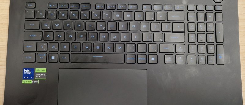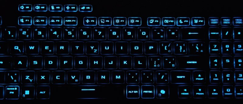 Po otevření víka nás přivítá palmrest s klávesnicí, která má celkem příjemné rozložení kláves, numerický blok je vesměs úplný, zapínací tlačítko sedí mimo a máme i tradiční klávesy pro nastavení zvuku a chování ventilátorů. Klávesnice má samozřejmě RGB LED podsvícení, které je konfigurovatelné v ASUS Armoury Crate.