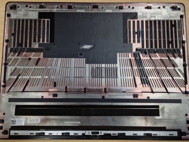 Spodní víko notebooku je z velké části plastové. Můžeme zde navíc vidět světlovod pro LEDky kolem dokola, v noci tak můžeme mít podsvícení okolo notebooku pro...epický efekt? Kulinářský herní zážitek? Založeno.