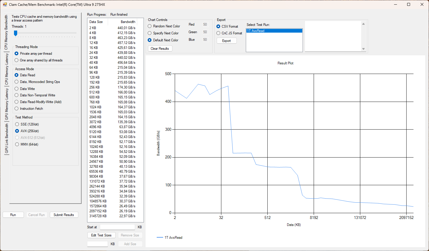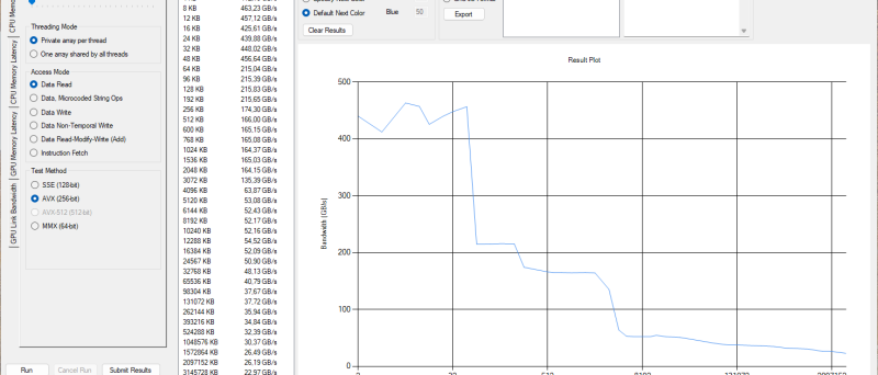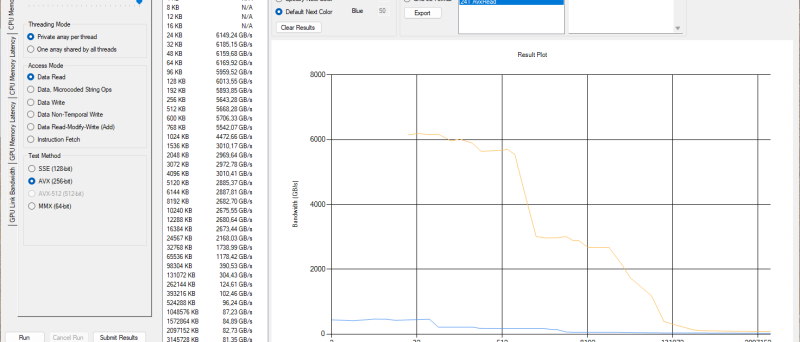 Nejprve se podíváme na rychlost čtení paměti, pokud se použije pouze jedno CPU jádro/vlákno. Do srovnávacího grafu uvádím hodnotu u "nejvzdálenějšího" množství paměti, čímž se eliminuje vysoká propustnost L1/L2/L3 cache. Na screenshotu ale můžete vidět i jednotlivé kroky, jak nám propustnost postupně klesá.