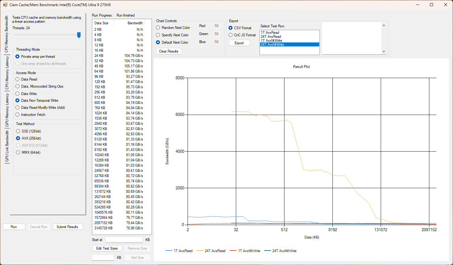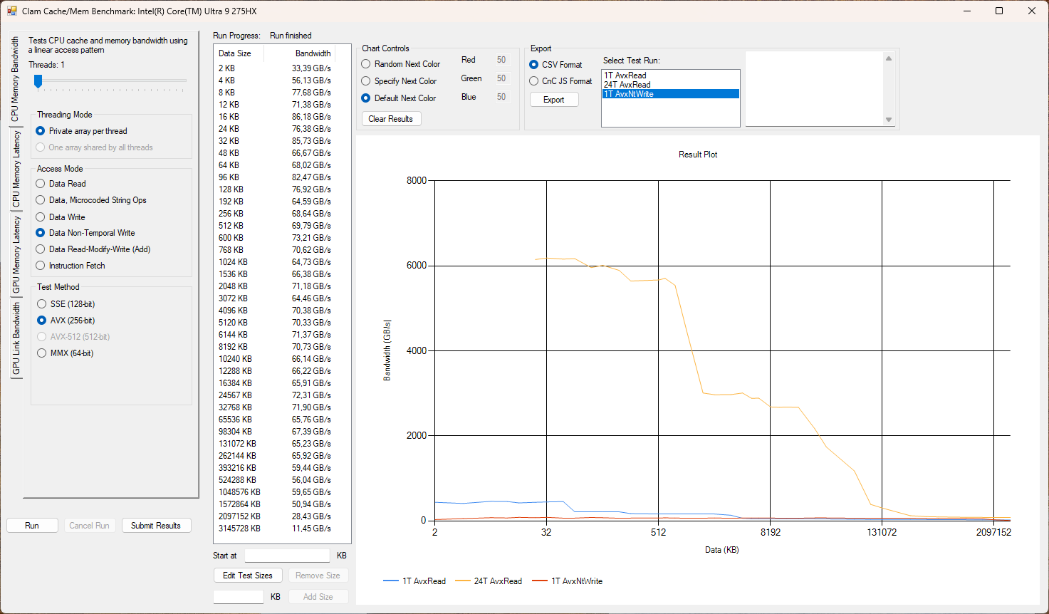 Důležitá je samozřejmě i rychlost zápisu do paměti. Opět zkouším nejprve jedno CPU jádro/vlákno s AVX instrukcemi a očekávám nižší propustnost oproti všem dostupným vláknům.
