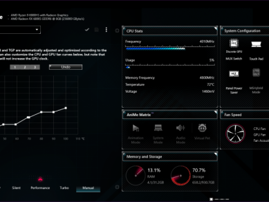 Nechybí samozřejmě klasický program ASUS Armoury Crate, ve kterém můžeme konfigurovat téměř vše. Můžeme aktualizovat ovladače, BIOS, konfigurovat AniMe Matrix displej, AI potlačení šumu u mikrofonů, RGB LED podsvícení, napájecí profily, přetaktování, ladit ventilátory, přepínat chování grafických karet, ovládat AMD Radeon Chill, Anti-Lag a Boost. Bohužel MUX čip lze konfigurovat pouze na hlavní obrazovce kliknutím na položku MUX Switch v sekci System Configuration, v BIOSu tato možnost zcela chybí.