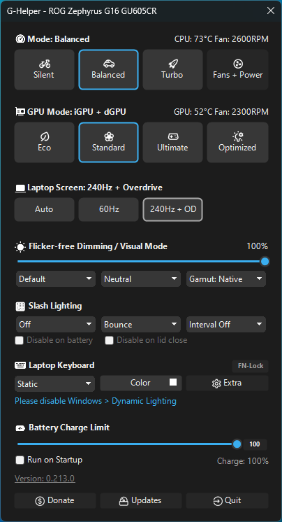 Než se podíváme na tradiční software, jež Armoury Crate zove se, nemohl jsem nezkusit G-Helper. Tato velmi odlehčená utilita umí nahradit mnohé funkce Armoury Crate, pokud chceme rychle měnit napájecí limity, profily a chování ventilátorů, je to možné.