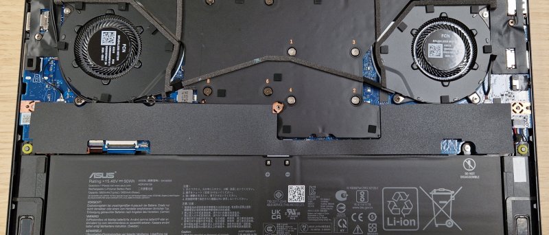 Co se týče zbylých vnitřností notebooku, můžeme snadno vyměnit baterii, WiFi kartu a dva M.2 SSD. ASUS bohužel osadil spíše línější QLC SSD společnosti Micron. Pozitivní je, že můžeme snadno druhé PCIe NVMe SSD přidat. RAM je bohužel připájená a tu tak snadno upgradovat nebo opravit nemůžeme.