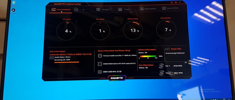 Na notebooku nebylo předinstalováno nic speciálního mimo několika Gigabyte utilit. Jeden z relevantních programů je Gigabyte Control Center. V tomto programu můžeme měnit napájecí profily, nastavit chování ventilátorů, konfigurovat RGB LEDky klávesnice, instalovat novější ovladače, software a tak podobně.