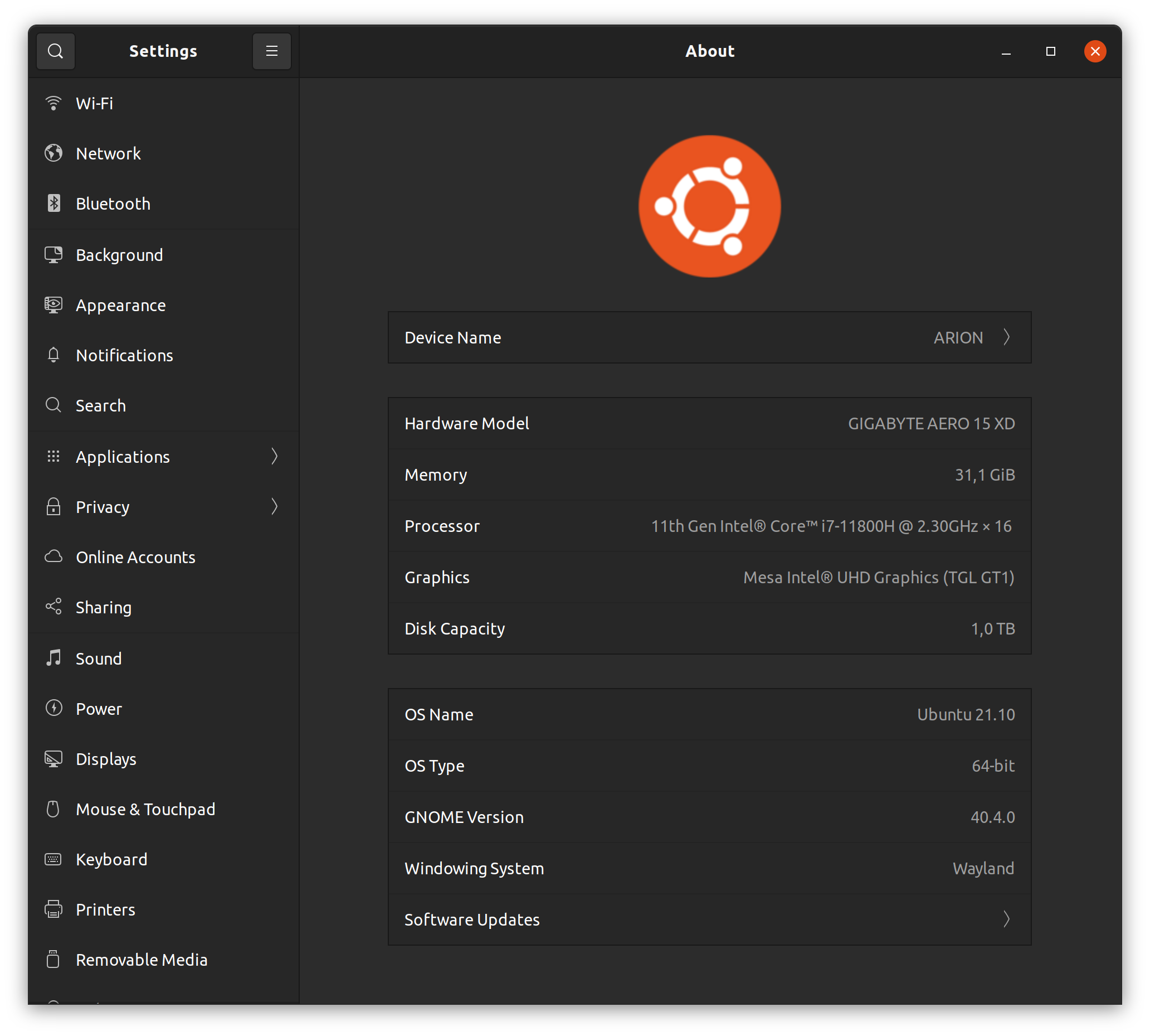 Nově jsem se rozhodl testovat alespoň zběžně podporu Linuxu na různých nových noteboocích, jelikož to některé uživatele může zajímat. Od ASUSU mám zapůjčený externí NVMe USB box ASUS Strix ARION, ve kterém bydlí Samsung PM981 512GB PCIe NVMe SSD. Na tomto SSD bydlí nově ubuntu 21.10, upgradované přímo ze staršího Ubuntu 21.04, které bylo v minulosti upgradováno z ještě starší verze.