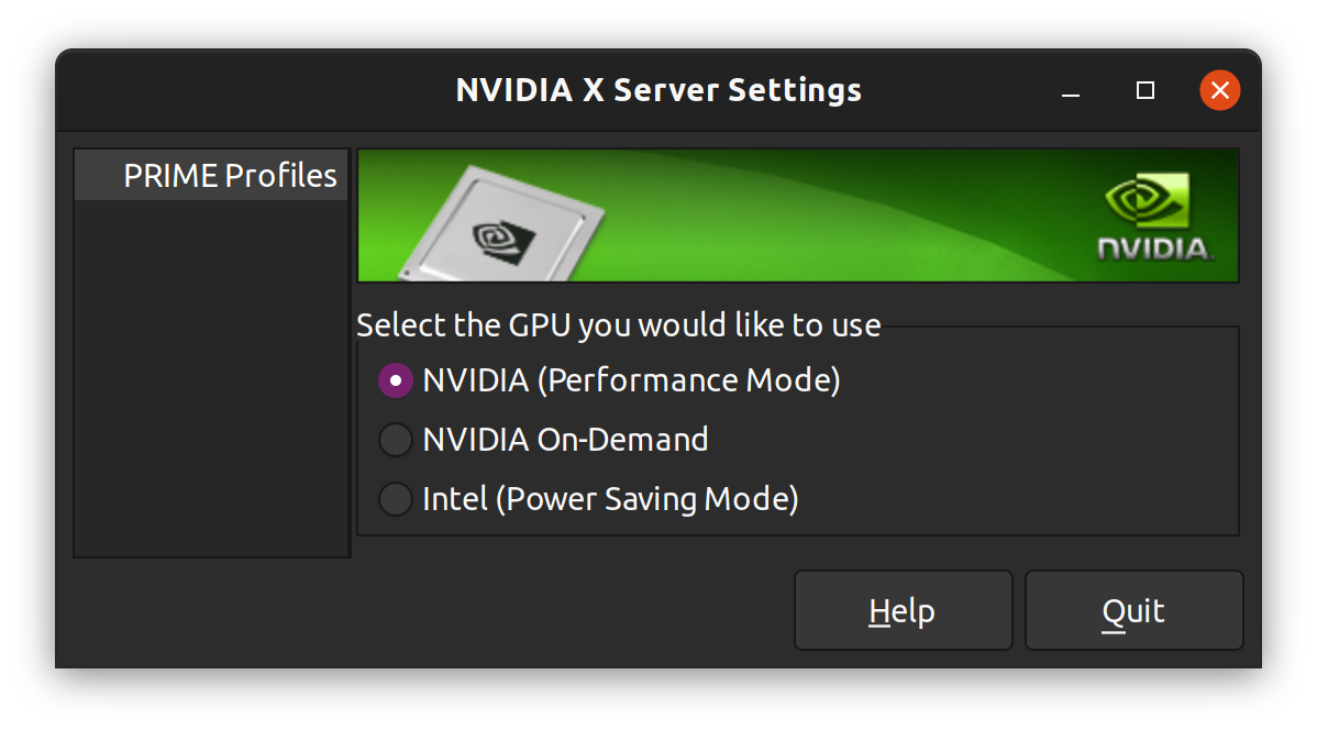 Do Ubuntu jsem se dostal bez potíží, notebook nepoužívá žádný super speciální hardware, který by nebyl podporovaný, tedy alespoň u těch nejhlavnějších komponent. Trochu jsem narazil u ovladačů grafiky, integrovaný Intel fungoval jak má, ale nějak se mi rozsypaly NVIDIA ovladače a nemohl jsem tak efektivně RTX 3070 použít, X SERVER GUI k ovladačům vypadalo takto: