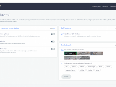Na notebooku toho mnoho předinstalováno nebylo, což je dobře, nechybí však obligátní trial verze McAffee a MS Office 365. Obojí můžeme ihned odinstalovat a využívat jiné alternativy, většila lidí si vystačí se zabudovaným Windows Defenderem a LibreOffice, případně si lidé koupíš spíše placené MS Office, ať už 365 nebo krabici. Níže si můžete prohlédnout screenshoty z Lenovo Vantage, což je taková klasika pro všemožnou konfiguraci a aktulalizace SW/FW na noteboocích společnosti Lenovo.