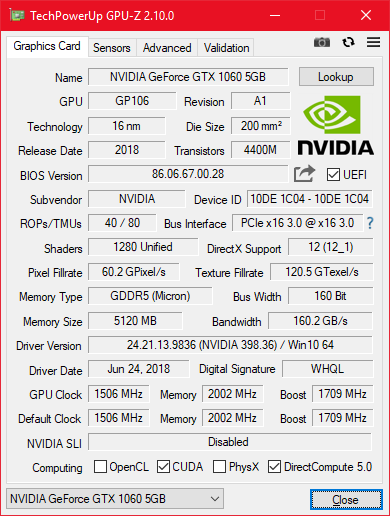 Koncem minulého roku vydala společnost NVIDIA další model oblíbené GeForce GTX 1060, tentokrát se jedná o téměř plně aktivní GPU GP106 s 1280 jednotkami, ale najdeme zde ořezaný paměťový řadič. Tento nový model má 5GB VRAM připojených přes 160-bit sběrnici, přičemž množství ROPs se snížilo na 40. Oproti GTX 1060 3GB má ale podobné takty, více VRAM a plný počet jednotek.