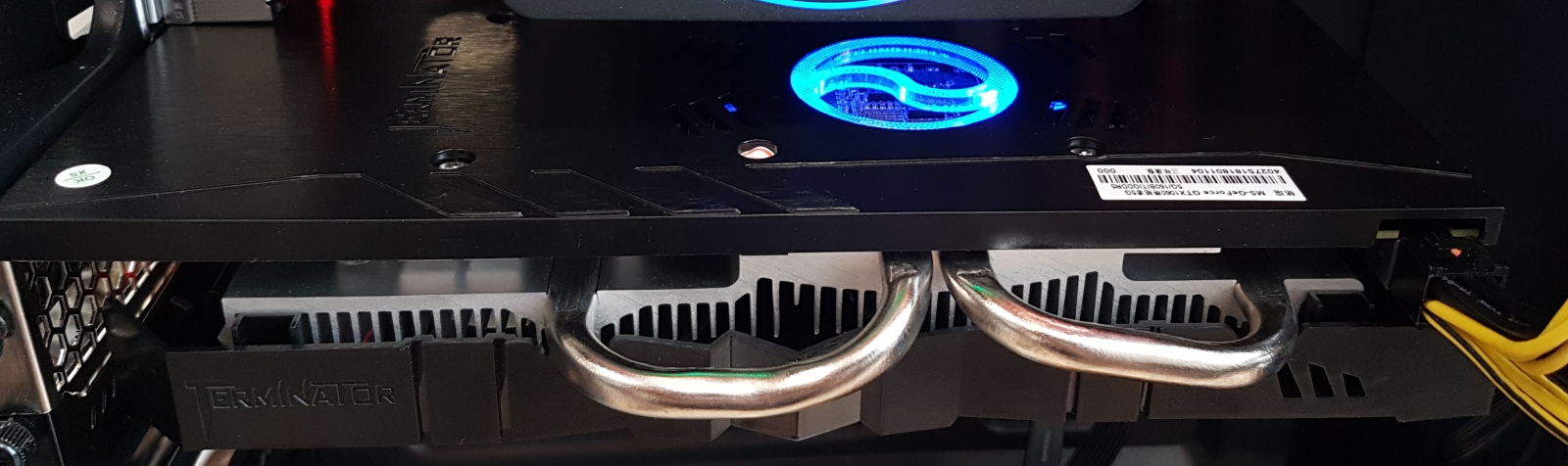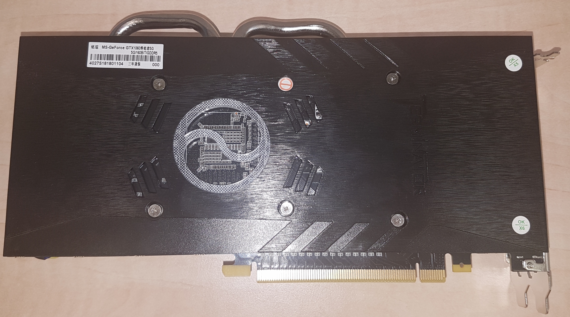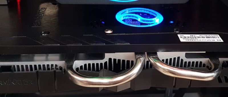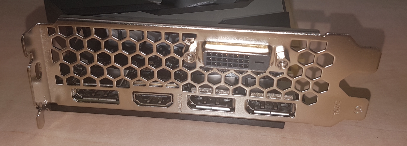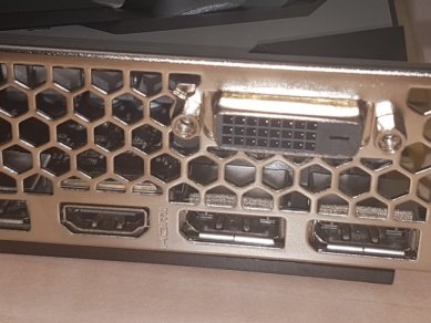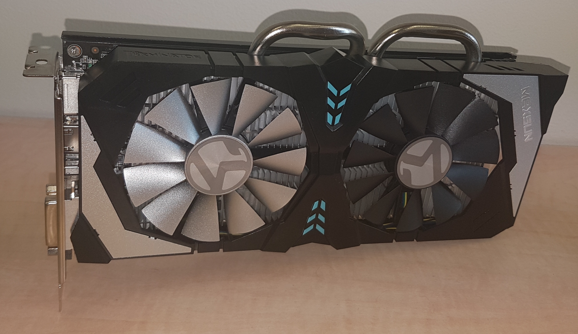 Karta má decentní chladič, kterému dominují dva ventilátory a dvě velké heatpipe, na 120W TDP GP106 by měl bohatě stačit, pasivní část je hliníková. Jak jsem zjistil během testování, karta nezastavuje ventilátory v idle nebo v nízké zátěži, což je škoda a nepůsobí to jako „SmartFan Technology“, kterou se MAXSUN chlubí na krabici. Co se týče výstupů, najdeme zde tři DisplayPorty, jedno HDMI a dokonce i jeden DVI-D výstup. Neměl by tedy být problém připojit čtyři monitory, nejlépe skrze tři DP a poslední přes DVI-D nebo HDMI.