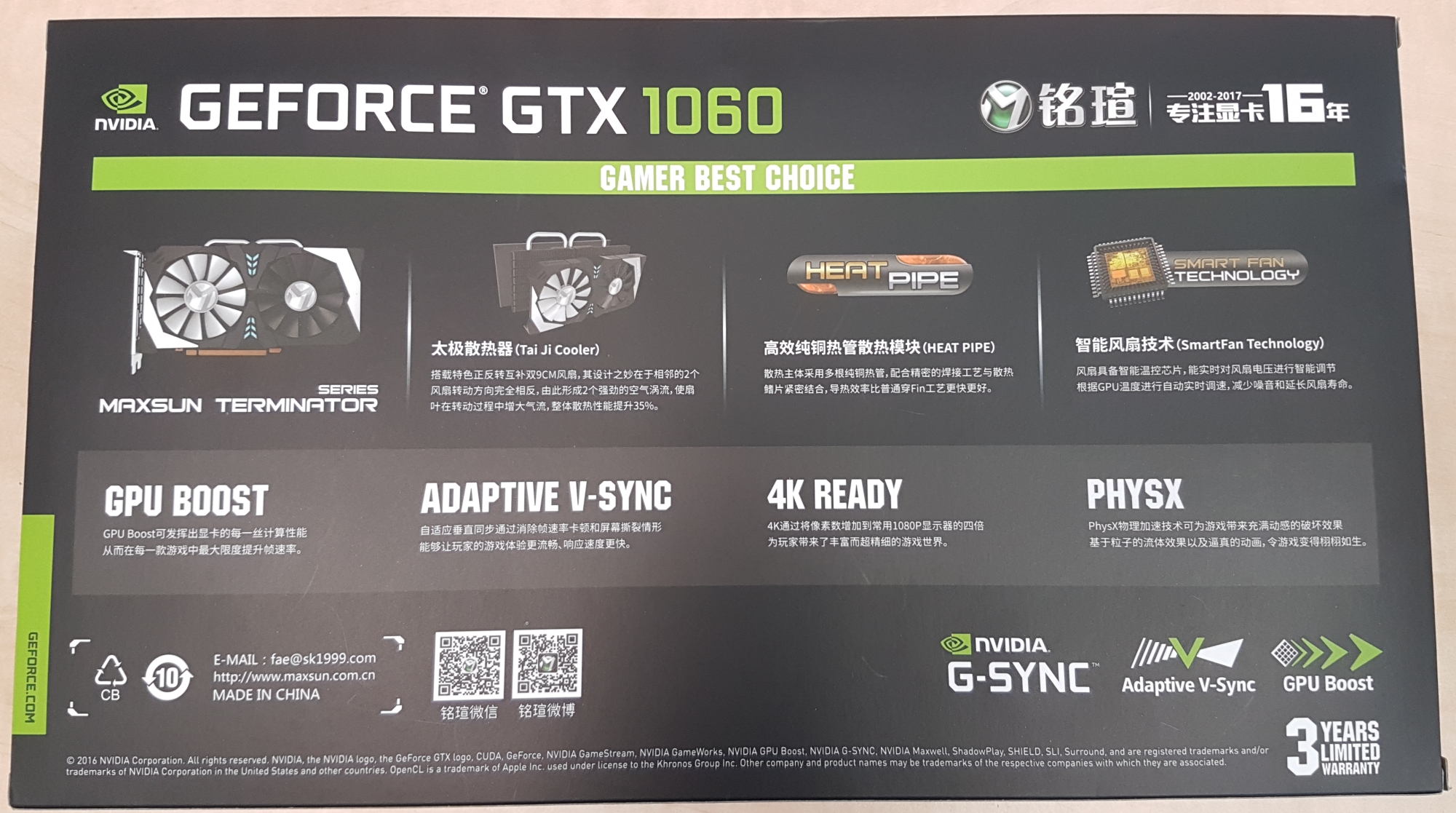 Samotná karta mi dorazila v prodejním a poměrně velkém balení, nejedná se tedy o chatrné balení v bublinkové obálce. Na samotném balení se MAXSUN chlubí, že jejich Terminator je 4K ready, má heatpipe, smart fan technologii a samozřejmě jsou zde zmíněny standardní technologie společnosti NVIDIA jako třeba PhysX nebo G-Sync.