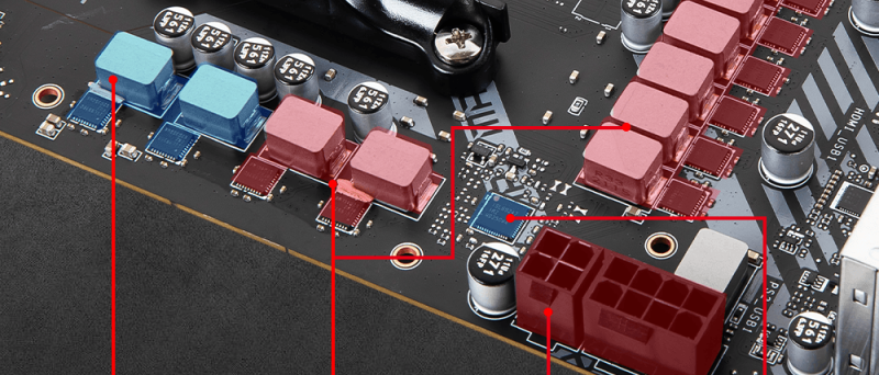 Napájecí kaskáda je vybavena 12ti fázemi pro procesor a dalšími dvěmi pro SOC. S 60A na jeden je zde dostatečná rezerva i pro ty nejvýkonnější procesory určené pro patici AM4 a domnívám se, že bude dostatečná i pro nové modely s 3D cache, které mají ještě přijít.