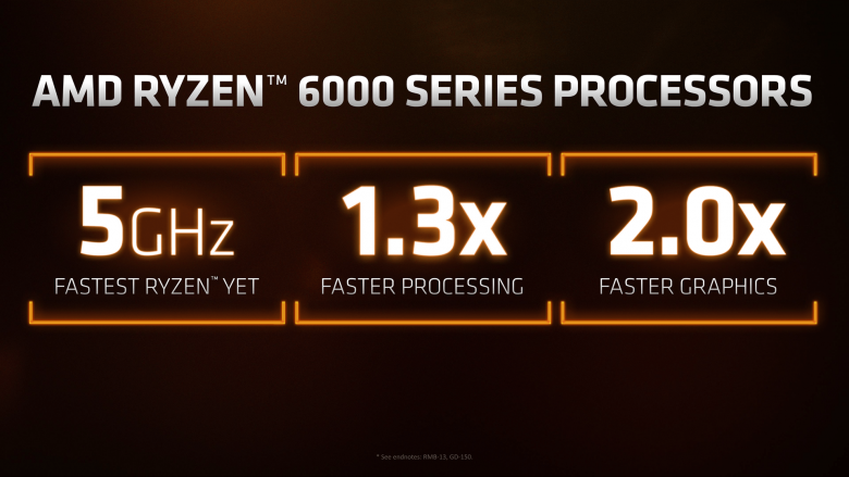 Všechny modely řady H jsou postavené na APU Rembrandt. Kdo chce levnější alternativu, bude mít zkráta k dispozici předchozí generaci. Top model Ryzen 9 6980HX posouvá boost procesorových jader o 200 MHz (4,2 %), Ryzen 9 6900HX o 300 MHz (6,5 %) a úspornější Ryzen 9 6900HS dokonce o 400 MHz (8,9 %). Přesto nelze očekávat výrazně vyšší posuny výkonu než naznačují tato čísla - Zen 3+, jak název napovídá, není Zen 4, ale prostě Zen 3 na 6nm procesu s lehce doladěným návrhem.