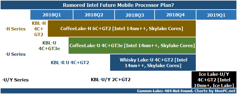 Pokud jde o mobilní svět, přijdou jako první šestijádrové 45W modely Coffee Lake pro notebooky, poté budou stávající čtyřjádrové modely Kaby Lake pro Ultrabooky s lepší grafikou GT3e nahrazeny čtyřjádrovými modely Coffee Lake. Ultrabookové modely se standardní grafikou nahradí až v polovině roku nahradí řada Whiskey Lake, také 14nm čtyřjádro. Tato 15W řada je jediným produktem zmíněným v tomto článku, který zatím nebyl oficiálně potvrzený. O jeho existenci se ale hovoří již zhruba deset dní a dosud se nikdo o její vyvrácení nepokusil, alespoň co je mi známo.