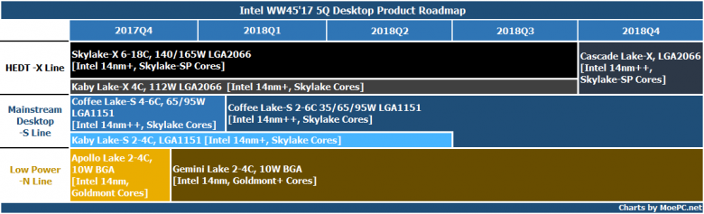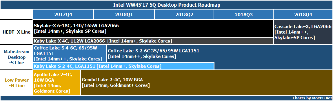 HEDT segment rovněž zůstane ve stávajících kolejích, změna má nastat až ve čtvrtém kvartálu 2018, kdy bude uvedena Cascade Lake, což je v podstatě - podobně jako Kaby Lake a Coffee Lake další 14nm refresh architektury Skylake. Víme, že Cascade Lake nastoupí jak v HEDT segmentu, tak v serverech (Xeony).
