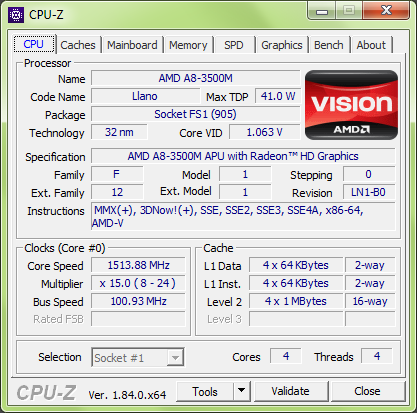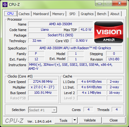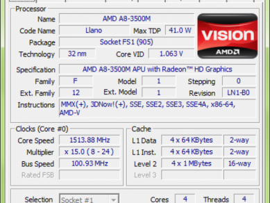 - AMD A8-3500M (1,5GHz, Tubo až 2,4GHz, 4C/4T, 35W TDP, 32nm)