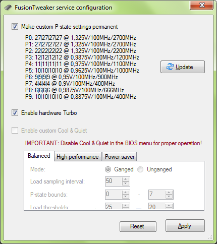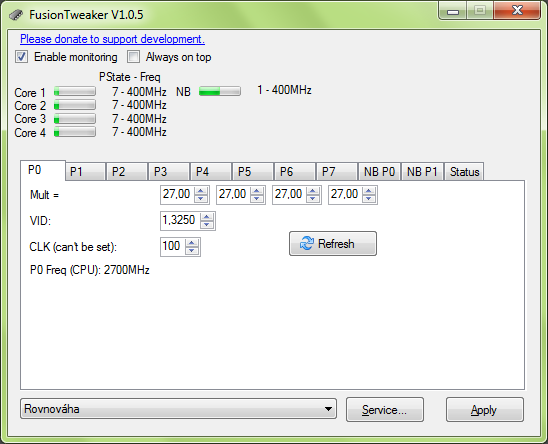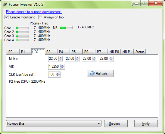 FusionTweaker nám umožňuje měnit jednotlivé PStates procesoru a protože mají mobilní AMD Llano procesory odemčený násobič, je možné si zde hrát i s navyšováním frekvence a také je možno navyšovat napětí do procesoru. Bohužel nelze hýbat s frekvencí GPU a severního můstku.