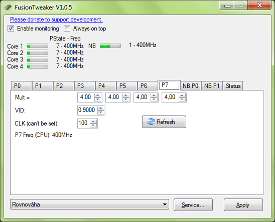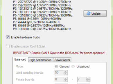 Jako bezpečné přetaktování u těchto notebooků považuji rozšířit defaultní Turbo boost i na P1, tím se zajistí, že procesor v zátěži bude tikat na maximální Turbo frekvenci i po době, kdy vyprší P0. Velmi zajímavým aspektem jsou i možnosti podtaktování a podvoltování, musím tedy doporučit i úpravu P7 stavu, což je minimální frekvence, na které APU běží. V případě AMD A8-3500M je to 800MHz @ 0,9250V. V mém případě skvěle funguje podtaktování a podvoltování na 400MHz @ 0,9V.
