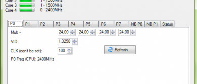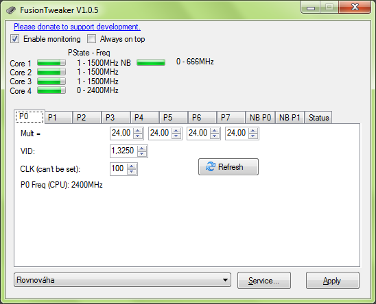 Nyní se podíváme, jak APU vlastně přetaktovat a vymáčknout nějaký ten výkon navíc. S touto generací totiž AMD představilo u svých mobilních procesorů Turbo boost, funguje však jinak než Turbo boost u Intel procesorů. V případě těchto APU zde existuje PState0, který má typicky maximální Turbo frekvenci, v našem případě se jedná o 2400MHz. Bohužel toto Turbo nevydrží velmi dlouho a frekvence procesoru tak klesne na další power state, typicky na PState1 a ten je u těchto procesorů nastavený na 1500MHz, tedy základní frekvence. V praxi se tato APU velkou spoustu času podtaktují právě na základních 1500MHz. A to je moment, kdy do dveří vchází software jménem FusionTweaker v1.0.5.