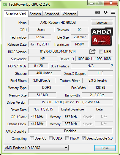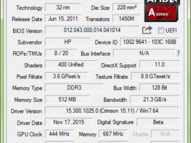 Testovat však budeme jen s AMD A8-3500M. Notebook má také přídavnou grafickou kartu, konkrétně AMD Radeon HD 6470M s 1GB GDDR3 VRAM na 64-bit sběrnici. Toto GPU má 120 shaderů a jedná se v podstatě o přeznačený mobilní Radeon HD 5470. Notebook podporuje Dual Graphics, to má však smysl hlavně s nejslabším AMD E2-3000M, které má podobné množství shaderů a podobný výkon. Dual-Graphics je totiž totálně rozbitý, pokud ho zkoušíme použít společně s AMD A6-3420M nebo A8-3500M, jelikož iGPU v APU je o dost výkonnější, CrossFire pak funguje asymetricky a můžete tak narazit na podivné propady ve výkonu, artefakty a podobné radosti.
