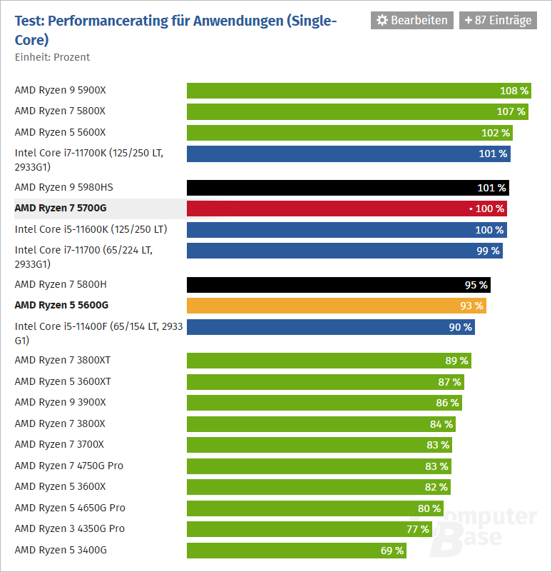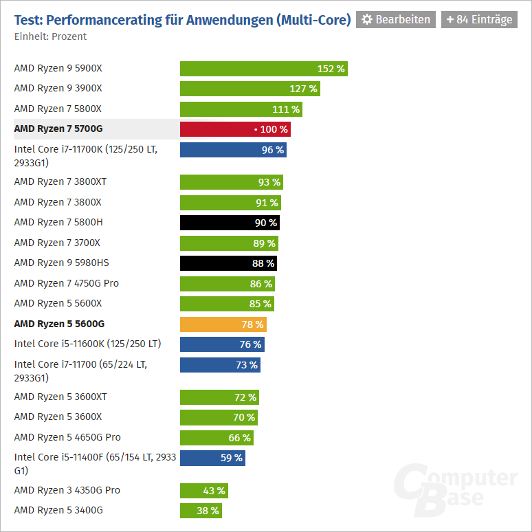 Podle testů ComputerBase dosahuje v aplikačním vícejádrovém výkonu pozice 4 % nad Intel Core i7-11700K.