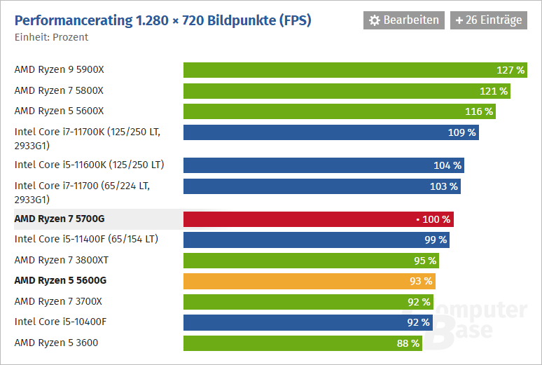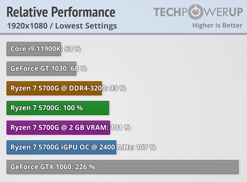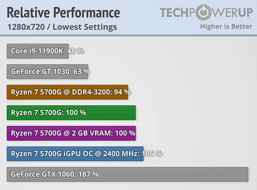 Redakce ComputerBase netestovala výkon integrované grafiky (což je poměrně podstatný parametr pro uživatele, který čeká na tyto produkty právě proto, že mají integrovanou grafiku), takže se díváme na souhrnné grafy od TechPowerUp v 720p a 1080p. Ryzen 7 5700G je ~2× rychlejší než Core i9-11900K a zhruba o polovinu rychlejší než samostatná GeForce GT 1030.
