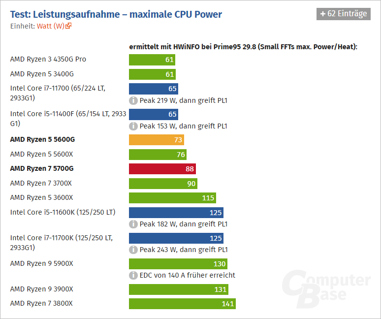 Ještě výrazněji se oba procesory vzdalují v zátěži (měřena čistě spotřeba CPU), kdy Ryzen 7 5700G nepřekonává 88 wattů, zatímco Core i7-11700K konzumuje až 243 wattů během PL2 a po jeho vyčerpání spotřeba klesá na 125 wattů. Jde tedy o rozdíl 155 wattů v maximu a 37 po vyčerpání PL2 limitu.