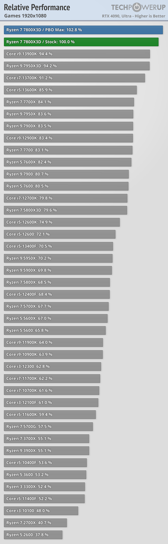 Ryzen 7 7800X3D vychází jako nejrychlejší herní procesor vůbec (bez ohledu na to v jakém rozlišení). Oproti Core i9-13900K je o 7,4 % rychlejší v 720p a o 5,9 % rychlejší v 1080p.
