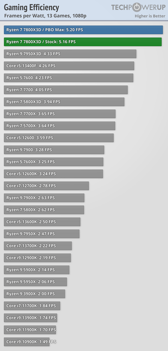 Podle toho vypadá i graf herní energetické efektivity, kde má Ryzen 7 7800X3D skoro generační náskok nad vším ostatním. Především pak nad Core i9-13900K, které s 3× horším výsledkem skončilo na třetím místě od konce. Za pozornost stojí, že použití PBO (Precision Boost Overdrive) nijak nezhoršilo herní energetickou efektivitu, takže se ho skutečně vyplatí použít. S PBO dosahuje Ryzen 7 7800X3D v 720p o 11,6 % lepšího herního výkonu než Core i9-13900K. V 1080p pak má 8,9% náskok.