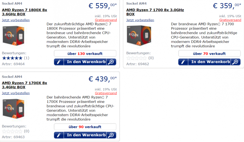Vyhrál to model Ryzen 7 1800X, kterým dala AMD signál „výkon Intelu za méně než polovinu“. Oficiální cena $499 byla nastavena v kontrastu k oficiálním $1100 (reálně spíše ~$1050) Intel Core i7-6900K. Ryzen 7 1800X má vyprodaný jak Amazon, tak Newegg. Přestože zprvu zlí jazykové tvrdili, že důvodem bude, že jej AMD naskladnila v menším množství než nižší řady, opak je pravdou. Německý prodejce Mindfactory průběžně zveřejňuje objemy objednávek (zaokrouhlené na desítky) a do soboty prodal R7 1800X v téměř takovém množství, jako R7 1700X a R7 1700 dohromady. R7 1800X objednalo 130 zákazníků, R7 1700X 90 zákazníků a R7 1700 70 zákazníků.