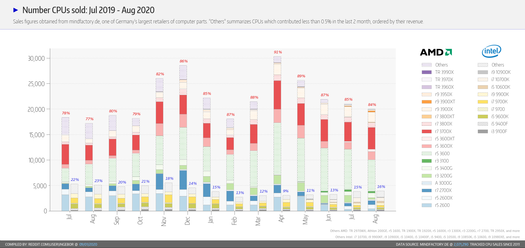 Počet procesorů prodaný podle statistik německé Mindfactory