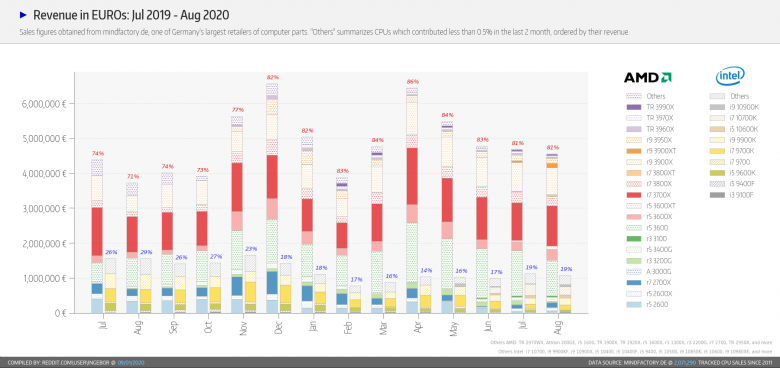 Jak ukazují výsledky retailových prodejů v Německu, tento „nudný“ o 100 MHz přetaktovaný Ryzen 9 3900XT oslovil více zákazníků, než zbrusu nové desetijádro od Intelu, až 5,3GHz herní špička, Core i9-10900K. Ryzenů se prodal prakticky dvojnásobek. Rovněž mainstreamový Ryzen 5 3600XT se prodává lépe než nové Core i5-10600K. Pouze s Ryzen 7 3800XT se AMD nepodařilo oslovit tolik zákazníků, jako Intelu s Core i7-10700K, které s přehledem vede. Je to trochu paradoxní, protože právě Ryzen 7 3800XT posunul ze všech tří modelů takty nejvíce, na druhou stranu je situace pochopitelná, neboť samotný Ryzen 7 3800X nebyl v rámci nabídky AMD bestseller a stál ve stínu úsporného (65W) Ryzen 7 3700X.