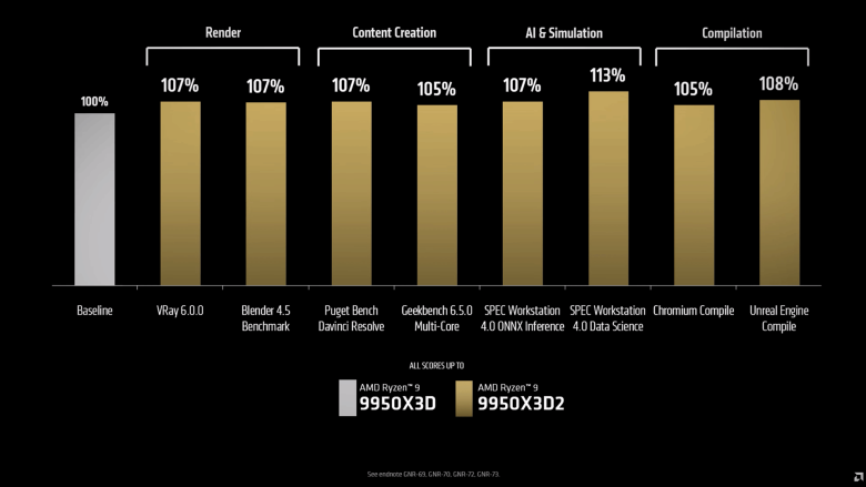 Nyní se jim AMD rozhodla vyhovět. V ohlášení mluví častěji vývojářích, tvůrcích obsahu a nadšencích, kterým tento procesor asi nabídne alespoň nějaký výkon nad rámec Ryzen 9 9950X3D. Podle zveřejněného slajdu v optimistických scénářích asi 5-10 %, jen zcela výjimečně více.