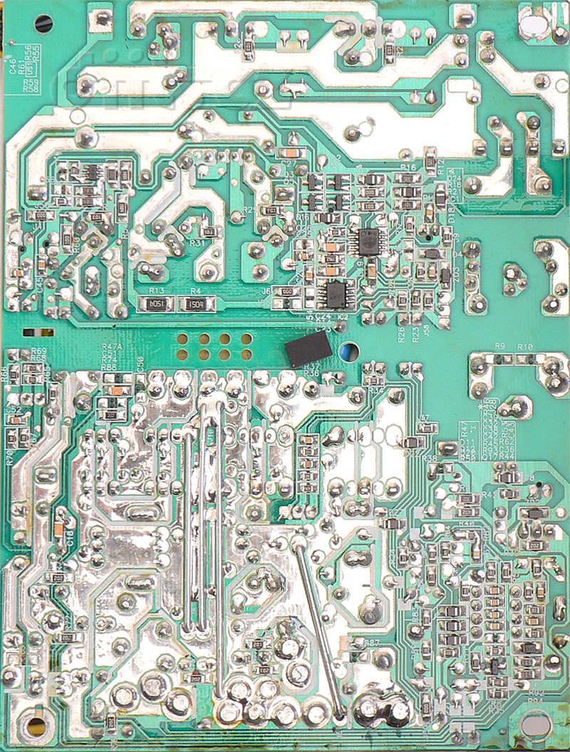 Zesílení vodivých cest je prvotřídní, takřka všechny výkonové cesty ve zdroji mají nanesenu silnou vrstvu pájky, zem na sekundární straně je rovněž zesílena drátovými spojkami (byť ta jedna šikmá je dost mizerně připájená). Zastřižení elektrod je dobré, byť jsou poměrně ostré. Nic nemá tendenci se někde dotýkat (a potenciálně zkratovat), kuličky pájky jsem neidentifikoval žádné, což je snad historický okamžik. Sráží to ovšem dost velký nános zbytků tavidla u spodní hrany (na fotografii), což tedy zde zdroji přinese základní hodnocení bez ztráty či zisku bodů.