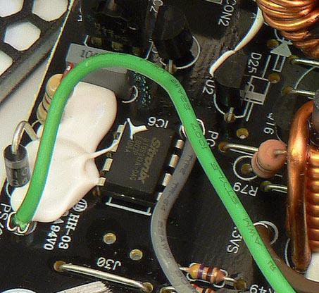 Jak že to dopadlo v přetížení u Eurocase ECO+ 85 500 W? Tam sice byly jen dva usměrňovače, ale jak víme, paralelizace u diod moc nepomáhá zvýšení maximálního proudu, tudíž tahat 45 A z 30A usměrňovače bude velmi zajímavé. A co teprve v přetížení! Jelikož (jak už jsem zmínil v preview) zdroje nemají ochranu proti přetížení, bude to velmi zajímavé. Jak by také mohly, (ne)známý monitor Sitronix ST9S313A-DAG s osmi piny zvládá leda zdroj zapnout, generovat Power Good a monitorovat podpětí/přepětí na třech větvích.