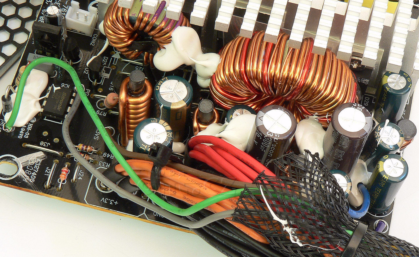 Zde se tradičně zaměřím na celkovou kvalitu továrního zpracování a věci jako např. elektrickou bezpečnost, jelikož kvalita jednotlivých komponent byla již zmíněna dříve. Na to, že se jedná o mainstreamový zdroj, se nešetřilo s bužírkou a izolační folií, většina součástek ve filtraci a některé na primární straně jsou takto dodatečně izolovány. Fixační srajdy je použito poměrně dost. Oddělení primární a sekundární strany je dobré, přidáno je vrtání pod hlavním transformátorem a optočlenem stand-by větve. Nicméně mohla by být větší mezera mezi vedením neusměrněného napětí a nízkonapěťovými řídicími obvody na primární straně.
